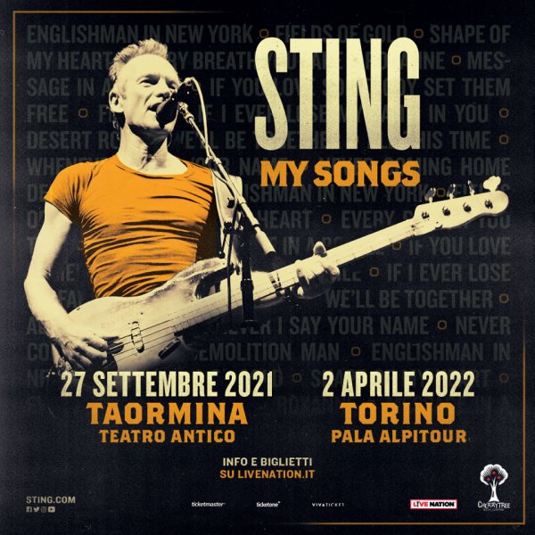 We are delighted to confirm that two further shows on Sting's My Songs tour have been added in Italy in Taormina and Turin. Sting will perform at Teatro Antico in Taormina on 27 September 2021 and at Pala Alpitour in Turin on 2 April 2022. Tickets will go on pre-sale to Sting.com members on 23 June at 10am and there will also be a Live Nation presale for the Turin show only on 23 June commencing 5pm. Both shows go on general sale 25 June 10. All times local.