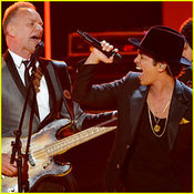 During the tribute to reggae legend ; Bob Marley 2013 Grammy Awards, you may have heard echoes of Sting's former band the Police in Bruno Mars' soul-soaked "Locked Out of Heaven" - the syncopated chirps and the frenetic sonic echoes of Synchronicity are shamelessly (and addictively) shot throughout the song. And Mars has even called himself out on the fact that the explosive song owes its musical roots to the Police. "I grew up listening to the Police. I grew up performing in bars, singing Police songs," Bruno told MTV News in 2012. "I remember performing a song like 'Roxanne,' and you play those first couple of chords, and you hit that first note, and you watch the whole bar ignite..."