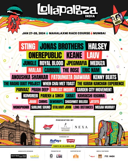 Sting, Jonas Brothers, Halsey and OneRepublic to headline second edition of iconic music festival in Mumbai - Lollapalooza India 2024 to also feature Keane, Lauv, Jungle, Royal Blood, JPEGMAFIA, Meduza, Malaa, Caribou, The Rose, Eric Nam, Anoushka Shankar, Fatoumata Diawara, Kenny Beats, The Raghu Dixit Project, When Chai Met Toast, Garden City Movement and many more across 4 stages and over 20 hours of piping energy and unforgettable live music. General on-sale of tickets for Lollapalooza India 2023 are now live on lollaindia.com. There are no fan club pre sales for this event.