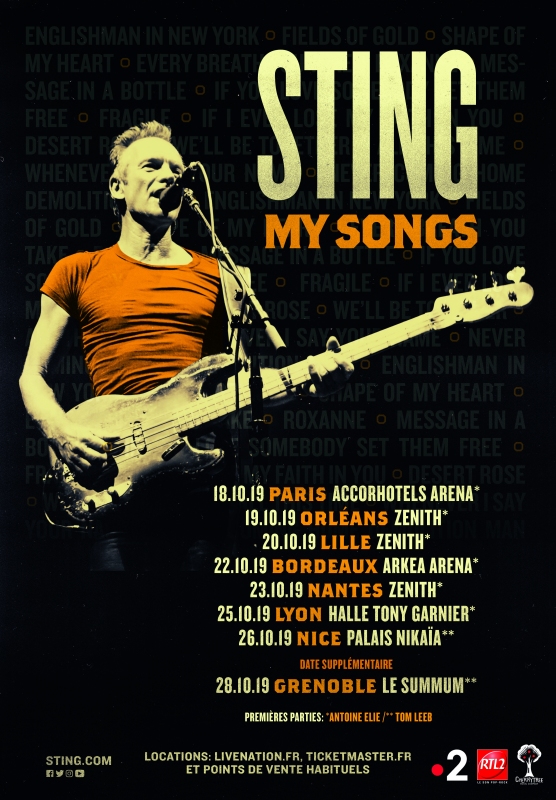 Cherrytree Management and Live Nation announced that special guests – Antoine Elie and Tom Leeb - will join Sting when he returns to France this fall with his My Songs concert.